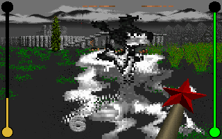 And most deadly (and funny) weapon - the magic wand. It's a melee weapon, but it exterminates any monster in one touch. Ogres vanish into thin air or t urn to mushrooms (which you later can pick as ammo for mushroom gun), spruces turn to cristmas trees, cheburashka-mutants (there's noone of them on these screenshots) turn to stone statues, and naked women turn to dressed ones.